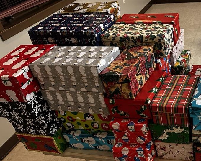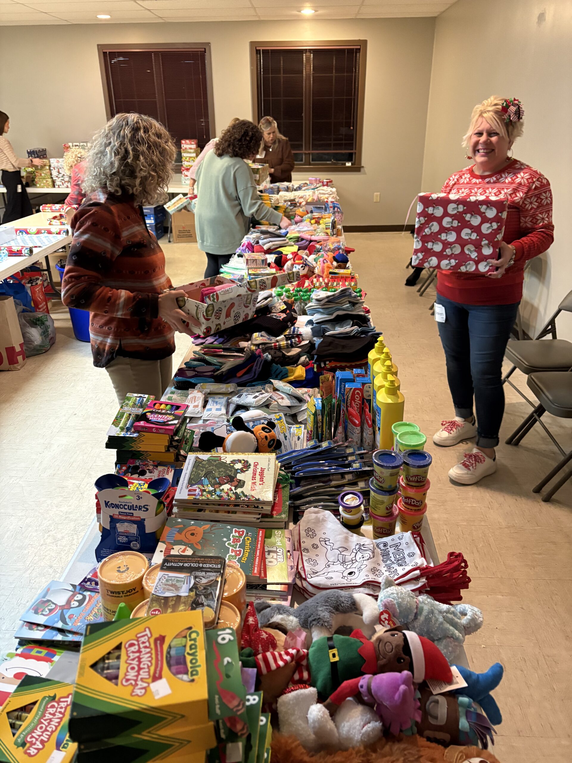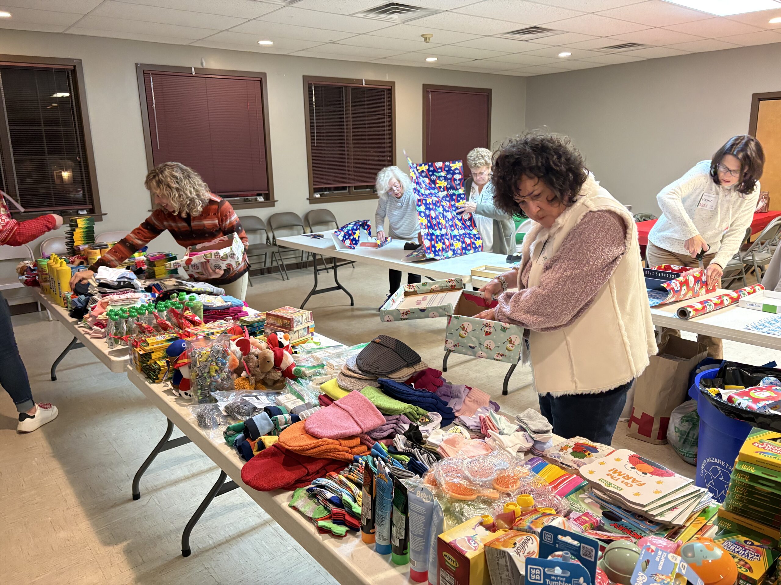 Our fifth annual shoebox packing event on Dec. 11, 2025, was another heartwarming demonstration of how generous and friendly the Invest in You community is. Our volunteers brought abundant donations of goodies, rolled up their sleeves, and wrapped and packed 100 shoeboxes filled with love. Cay Galgon Life House of Bethlehem will distribute them to the families the organization supports. The packages of bibs, hats, mittens, socks, snacks, crayons, toys and more will bring much joy to babies, toddlers and their mamas this Christmas.
